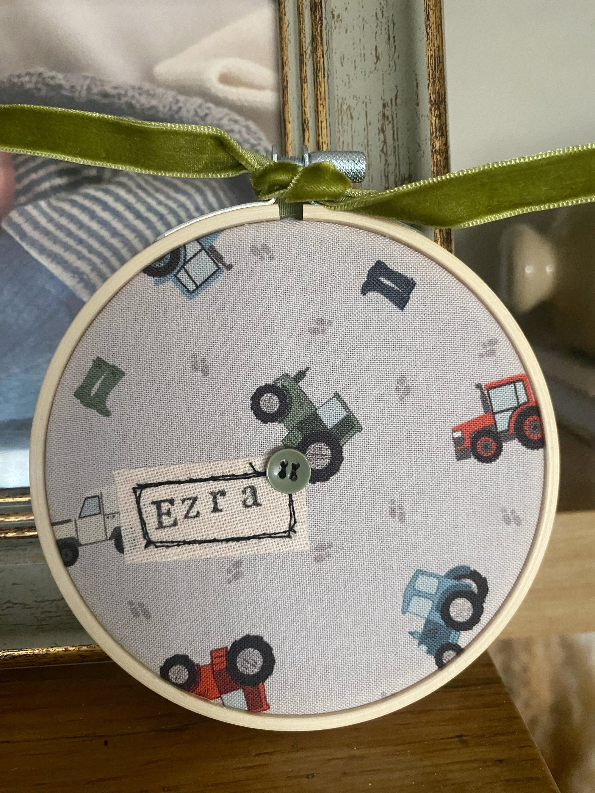Made from a beautifuul fabric and handstamped name, this hoop is finished off with a velvet ribbon and button that compliments the colours perfectly.