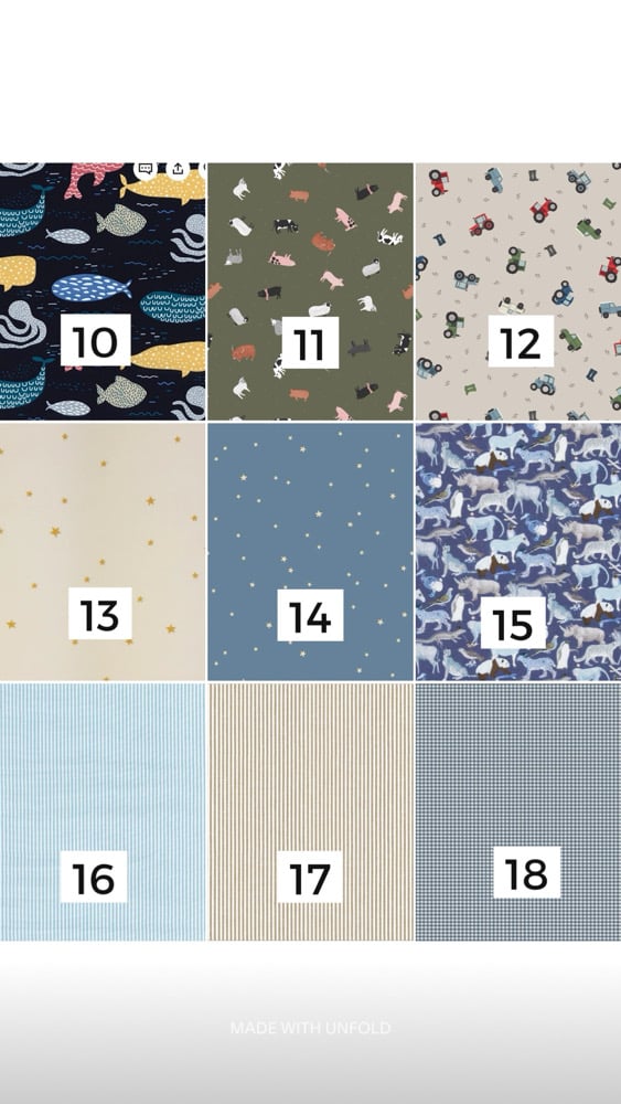 Simply choose from the two sizes and pick your favourite fabric. Please leave name details at checkout. Names can be printed or hand stamped.