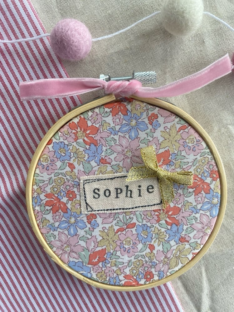 Made from a beautiful liberty fabric and handstamped name, this hoop is finished off with a velvet ribbon and bow that compliments the colours perfectly.